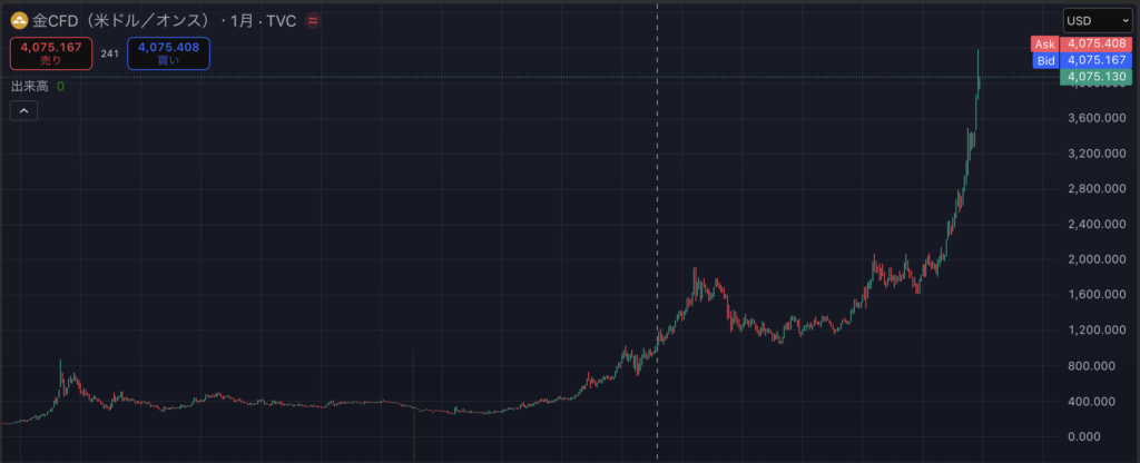 2025年11月時点の金CFDチャート:月足(TradingViewより引用