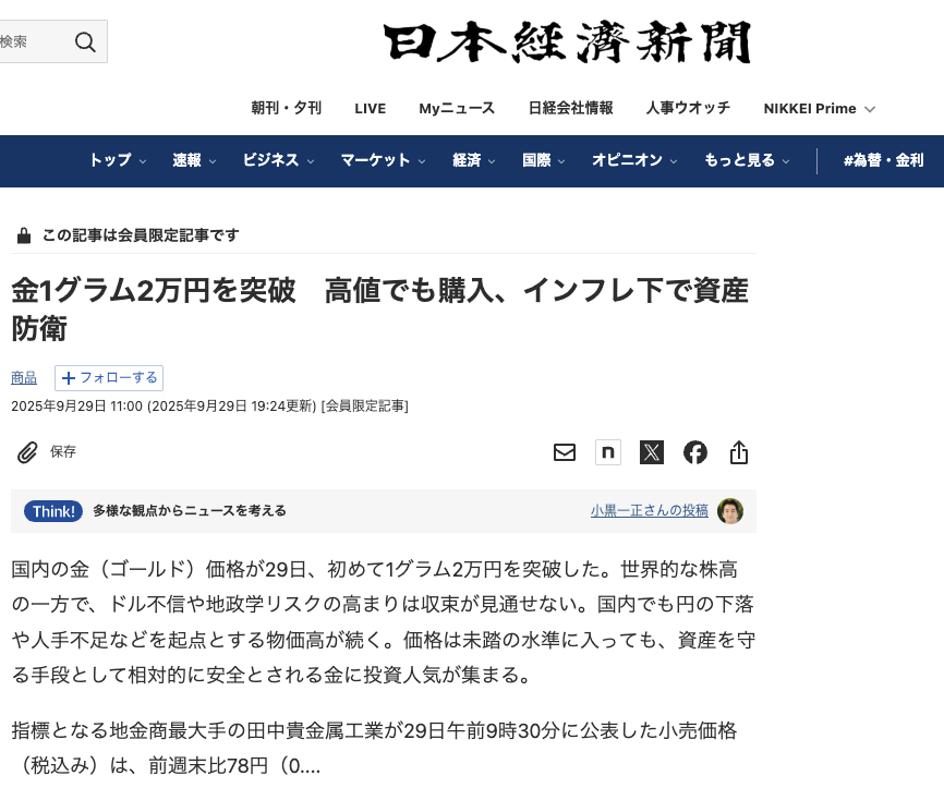 2025年9月、金(GOLD)価格が日本円で2万円を突破したというニュースが流れました。