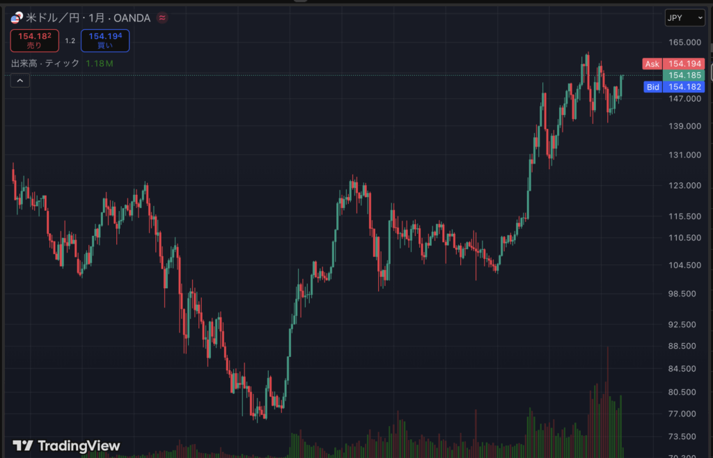 さらに為替の動き(米ドル円)も見てみましょう。2023年あたりから為替相場が一気に円安(グラフの上昇)に向かっていることがわかると思います。